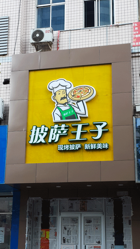 濰坊披薩王子餐飲連鎖LOGO設(shè)計及店招發(fā)光字制作、店內(nèi)海報、宣傳畫設(shè)計制作!