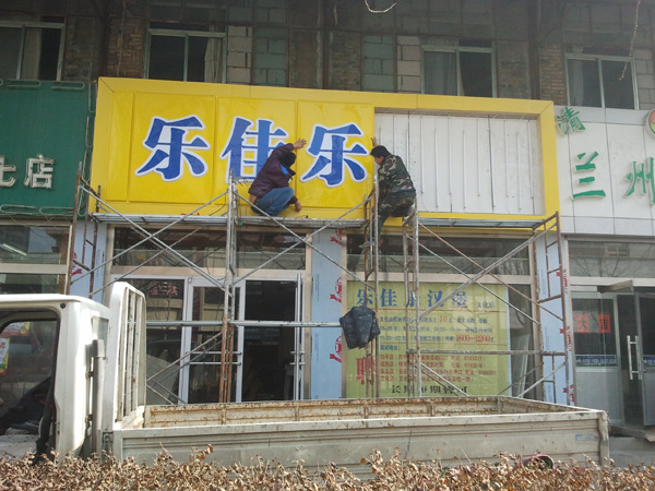 濰坊廣告公司&濰坊創(chuàng)視廣告專(zhuān)業(yè)亞克力吸塑門(mén)頭、鋁塑板門(mén)頭字牌、LED發(fā)光字、不銹鋼字制作,圖為濰坊樂(lè)佳樂(lè)炸雞漢堡連鎖四店制作的鋁塑板亞克力吸塑燈箱門(mén)頭及施工過(guò)程;